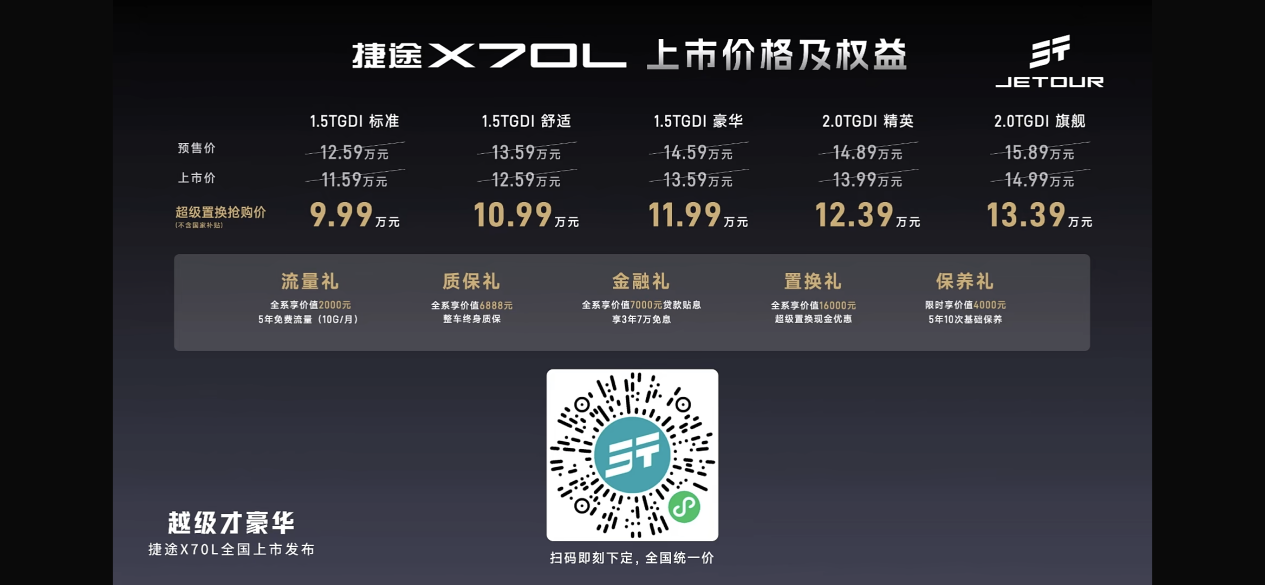 超级置换抢购价9.99万元起!日前,“中国大七座SUV标杆”捷途X70家族重磅新品——捷途X70L正式发售,新车定位“磁悬浮豪华电七座SUV”,五大越级实力重塑大家庭出行体验,一经上市便收获超高关注,助力捷途X70系向“百万销量时刻”加速迈进。