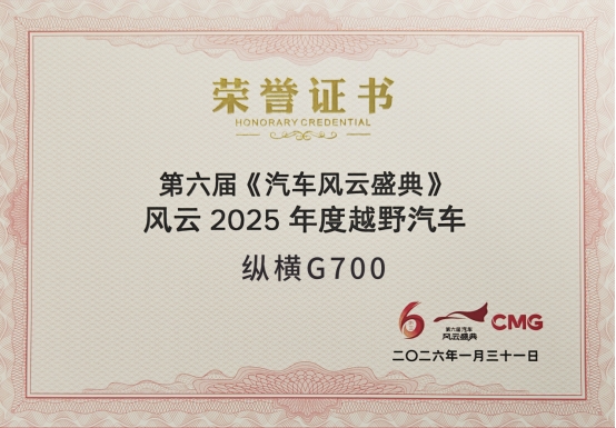 2月15日,第六届央视《汽车风云盛典》在北京隆重举行。纵横G700凭借“陆海空智享尊”六维硬核产品实力,荣膺“风云2025越野汽车”大奖。纵横品牌首款车型即获央视权威认可,标志着中国汽车工业在豪华越野领域,逐步实现从“追随者”到“引领者”的跨越,开创豪华越野新坐标。
