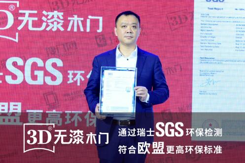 3D家居集团 此次全新升级的3D无漆木门这一品牌发展战略的推出,他们提到,不只是简单名称变化,更是3D家居集团从产品生产、运输、店面布置、安装、服务等一系列环保举措的提升。3D无漆木门是行业首家通过欧盟更高环保标准瑞士SGS环保检测,是对他们产品践行环保理念,做健康家居产品的一份满意答卷,也是对广大消费者的一份郑重承诺。 在这次的发布会现场,3D家居集团也邀请了SGS检测机构的嘉宾对于3D无漆木门产品给予最公正的评价同时还颁发了检测证书。